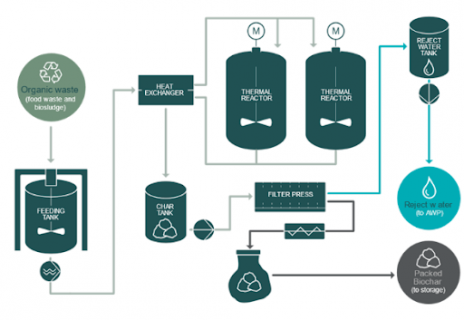 En la carbonización hidrotermal (HTC), los residuos orgánicos húmedos se procesan a temperaturas de aproximadamente 200 °C. El calor provoca una reacción química, donde los materiales de desecho se descomponen en una solución con agua suelta y material comúnmente conocido como bio carbón. El agua se puede secar mecánicamente, dejando dos corrientes: agua y bio carbón sólido seco. El agua se puede tratar en el AWWP existente del barco, y el bio carbón es fácil de desembarcar cuando el barco llega a puerto.