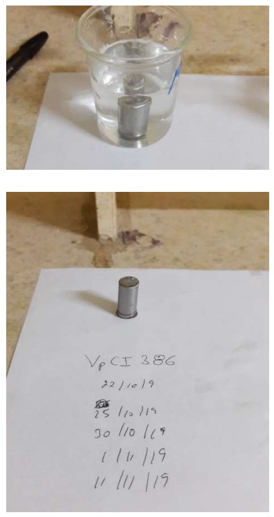 Evaluación: Se recubrió un trazo de varilla de acero inoxidable 304 de ¼” de diametro y 1” de largo, para posteriormente sumergirse en agua de mar sintética (ASTM D1141) por 20 días.