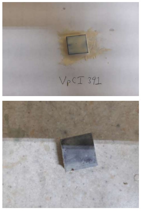 VpCI-391 Evaluación: Se aplicó VpCI-391 por medio de brocha a un muestra de solera acero al carbono A-36 sin recubrimiento , de 1” x 1” y 3 mm de espesor. Posteriormente la muestra recubierta se mantuvo inmersa en agua de mar sintética (ASTM D1141) durante 15 días.